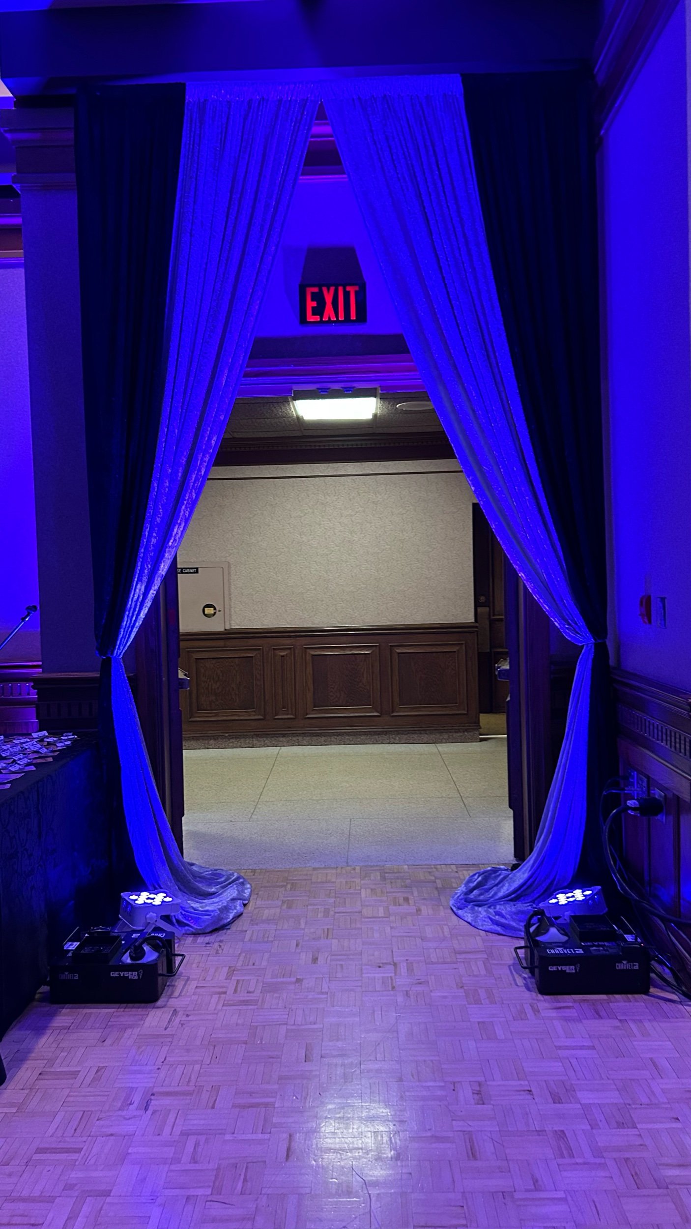 Windsor wedding decorators, Phat Boy Productions, provides custom entrance decor for wedding & events. Highlighting the entrance for the reception space with unique draping and lighting makes a fabulous impact for guests when they first enter the hall.